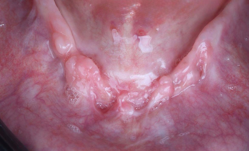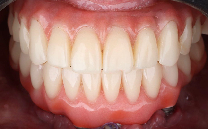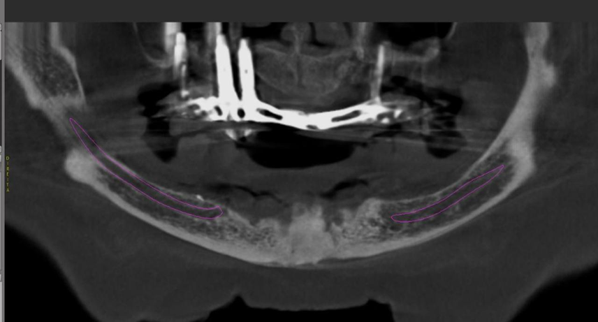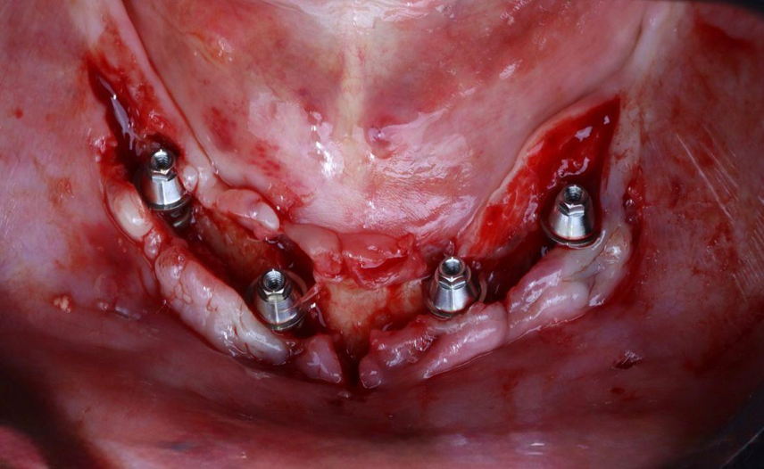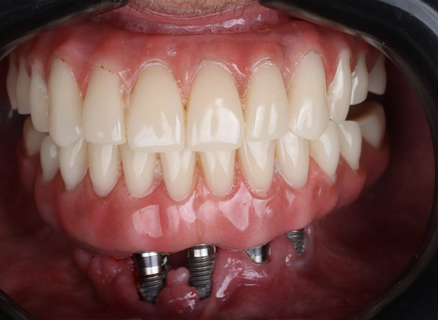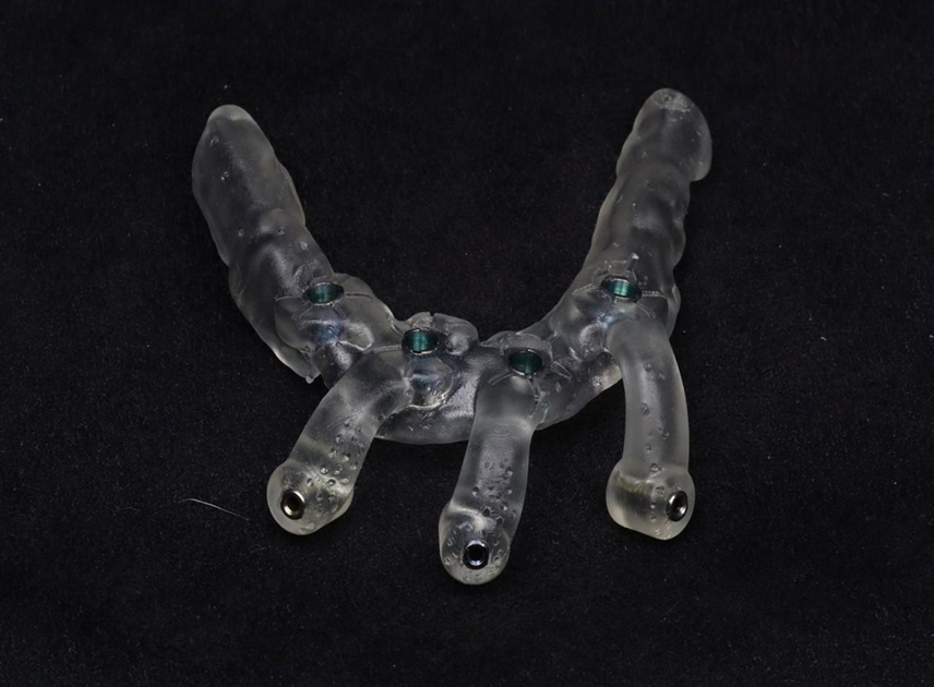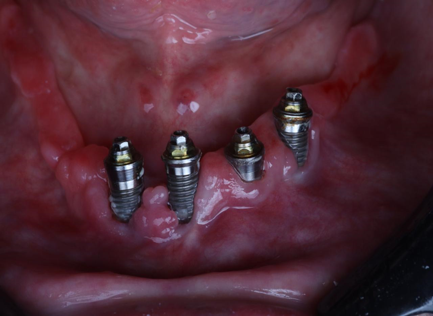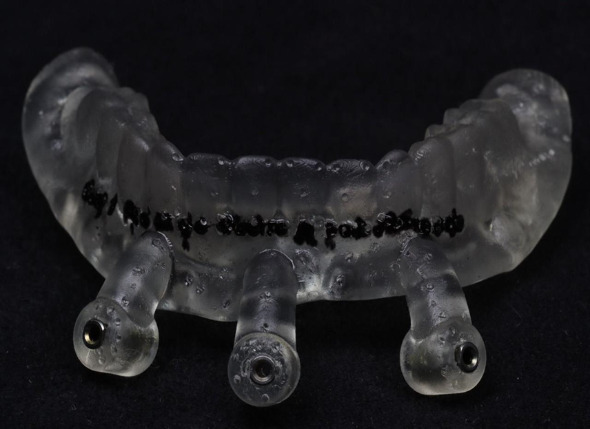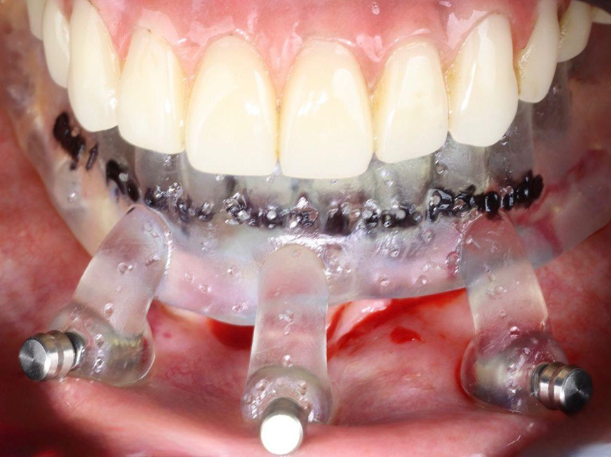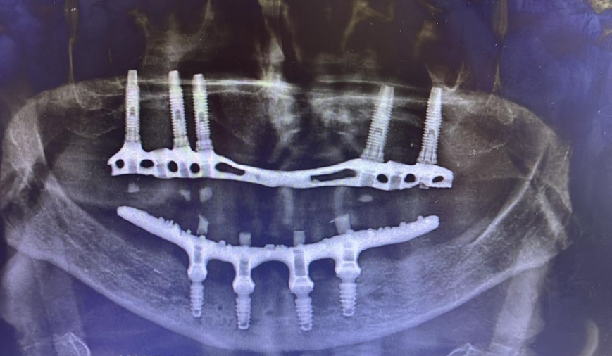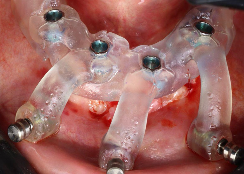 Paciente de 62 anos, do sexo feminino, sem comorbidades e história médica pregressa, apresentava severa reabsorção óssea em regiões anteriores e posteriores da mandíbula devido a uma peri-implantite (Figuras 1A e 1B). Feita a remoção dos implantes, a paciente optou por utilizar uma prótese total mucossuportada até a nova intervenção com prótese do tipo protocolo inferior. Após seis meses, a mandíbula encontrava-se cicatrizada (Figura 2). Como parte do protocolo diagnóstico, foi realizada tomografia computadorizada pela técnica do duplo DICOM. Com a severa perda óssea em região anterior de mandíbula, optamos por realizar a cirurgia de forma guiada, aumentando a previsibilidade e precisão da cirurgia. Os arquivos obtidos foram exportados para o software CoDiagnostiX, possibilitando a realização do planejamento reverso e o subsequente posicionamento virtual dos implantes (Figura 3). Com base no planejamento, optou-se pela instalação de quatro implantes Implacil Osstem CM AR Due Cone (3,5 x 7 mm), associados a mini-cônicos de 1,5 mm (Figuras 4A, 4B, 4C, 4D e 4E). A partir da tomografia da prótese da própria paciente, confeccionaram-se duas guias cirúrgicas: uma guia de pino de fixação (Figura 5) e uma guia de fresagem para a instalação dos implantes (Figura 6). Durante o procedimento cirúrgico, inicialmente foi posicionada a guia de pino de fixação para fresagem dos pinos de fixação e orientação da sequência cirúrgica (Figura 7). Após essa etapa, a guia foi substituída pela guia de fresagem dos implantes (Figura 8), utilizada para a fresagem e inserção dos implantes planejados (Figura 9). Concluída a instalação, optou-se por seguir o fluxo analógico, com a adaptação dos mini-cônicos 1.5 mm (Figura 10), realização da transferência de moldagem com silicona de adição leve e sutura com fio absorvível Vycril 6-0. O guia inicial foi adaptado com broca Maxicut, possibilitando sua utilização como molde de orientação para o laboratório protético (Figura 11). Após a moldagem, foram posicionadas as tampas de proteção sobre os implantes. Na fase protética, transcorridas 48 horas do procedimento cirúrgico, foi realizada a prova clínica da barra metálica e dos dentes (Figura 12). Na etapa subsequente, 72 horas após a cirurgia, procedeu-se à instalação e entrega do protocolo mandibular inferior e radiografia prévia, reabilitando funcional e esteticamente a paciente em curto espaço de tempo (Figuras 13A e 13B).