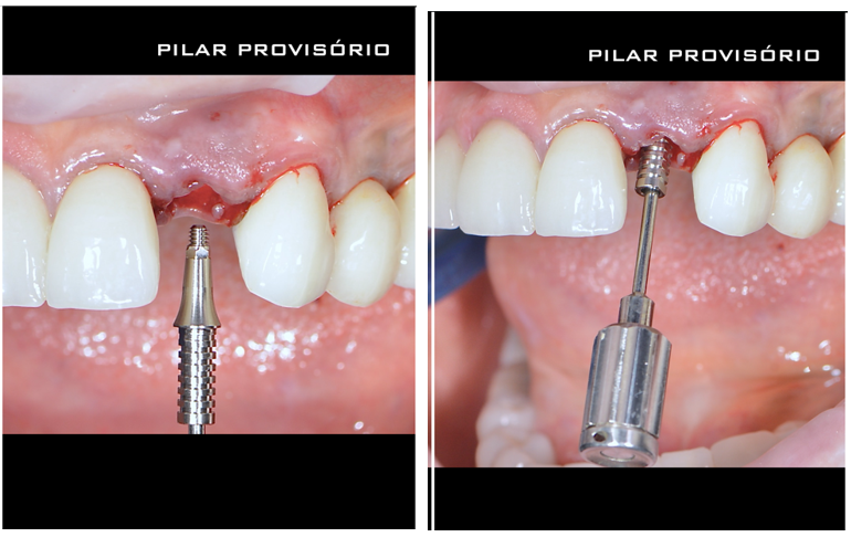 10- instalação do cicatrizador personalizado sobre o implante + biomaterial + coágulo sem encostar nos dentes vizinhos para que não haja contaminação.