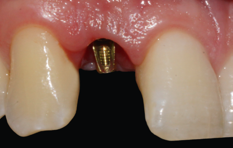 Nessas situações, nossa preferência é por implantes cônicos, com plataforma estreita e conexão tipo Cone Morse, posicionados de 4 a 5 mm abaixo do nível da margem gengival correspondente.