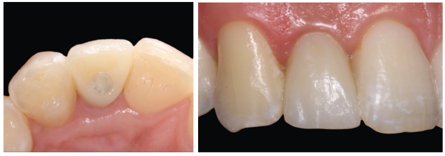 Embora a coroa cimentada sobre implante possa oferecer um resultado estético satisfatório, essa vantagem é contraposta pelos riscos associados ao cimento residual, que pode desencadear resposta inflamatória peri-implantar, além da impossibilidade de remoção ou recolocação da coroa. Por esse motivo, as coroas aparafusadas são preferíveis. O desafio, entretanto, está em posicionar o implante de maneira a permitir uma coroa com um canal de acesso ao parafuso que não interfira na borda incisal nem altere a anatomia lingual.